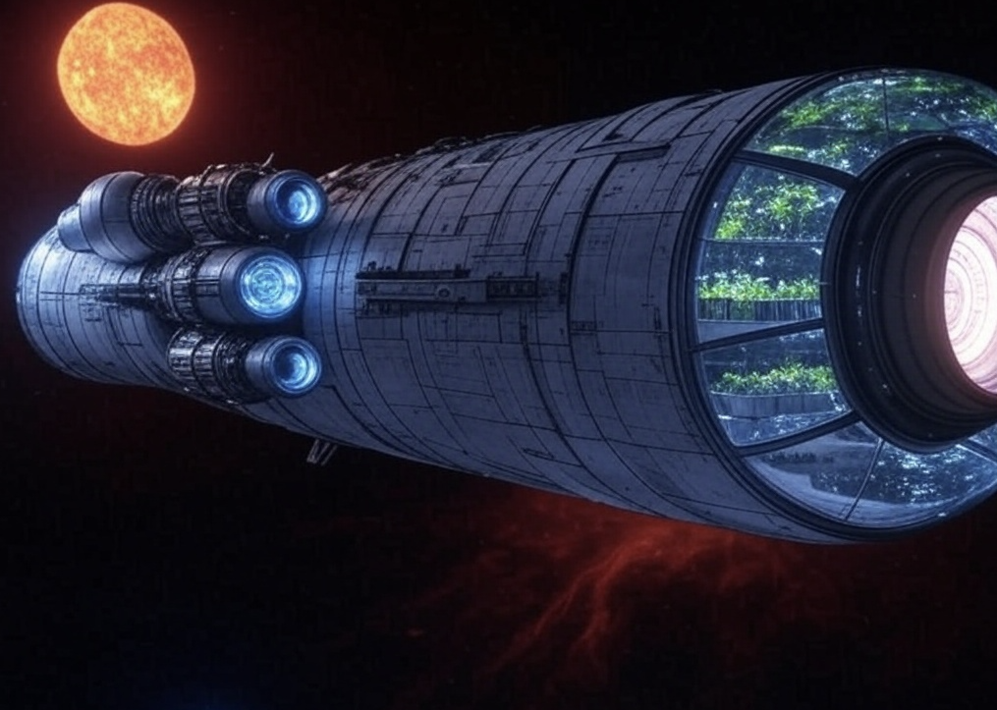 - Ship Design: 50 km-long, 10 km-wide rotating cylinder (1g via 0.13 RPM spin). Two fusion engines at opposite ends for balance and backup.